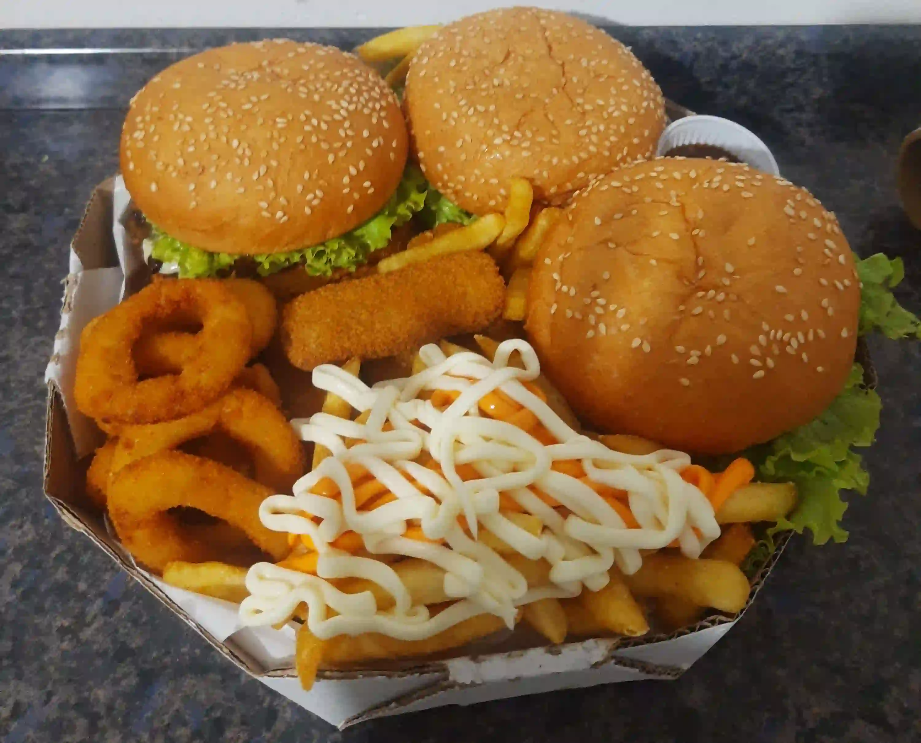 4x-tudo, batata com calabresa e cheddar, ovo de codorna, salgadinho, Onion Rings, nuggets e refri 2 litros